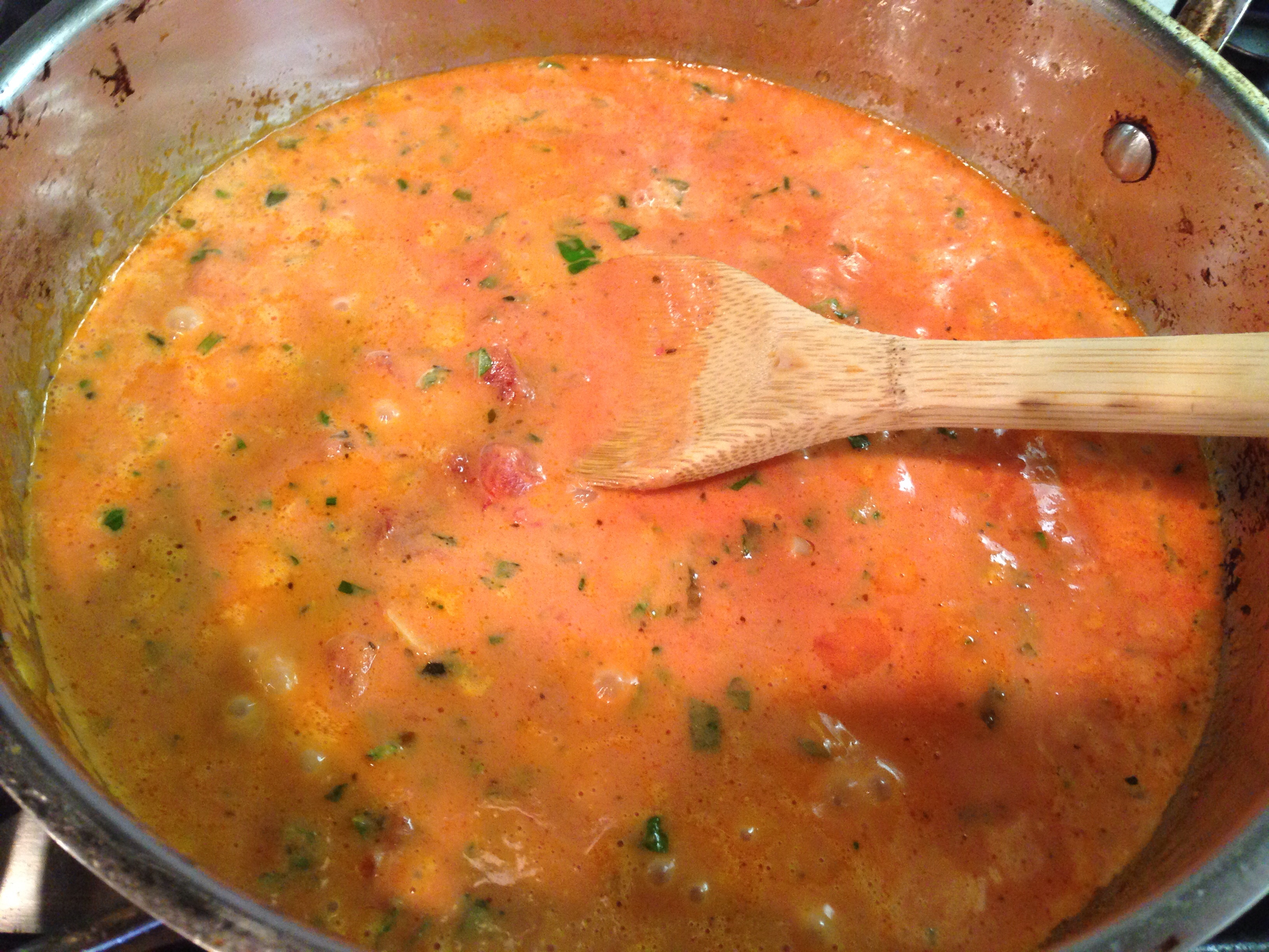 Cook pasta according to directions and drain. Set aside. Heat oil in large skillet over medium high heat. Add shrimp and half of the garlic (if it’s already cooked and defrosted, you are just heating it up. If it’s raw, cook until done, about 4-5 minutes). Remove shrimp from pan. Add the rest of the garlic and cook for about one minute. REMOVE PAN FROM STOVE and add the vodka (pouring alcohol into a pan that is a directly over a flame could be a recipe for disaster. I did it once….needed baking soda to put the fire out and ruined the dish). Anyway, cook the vodka for about one minute. Add the marinara, basil, cream, salt and pepper.